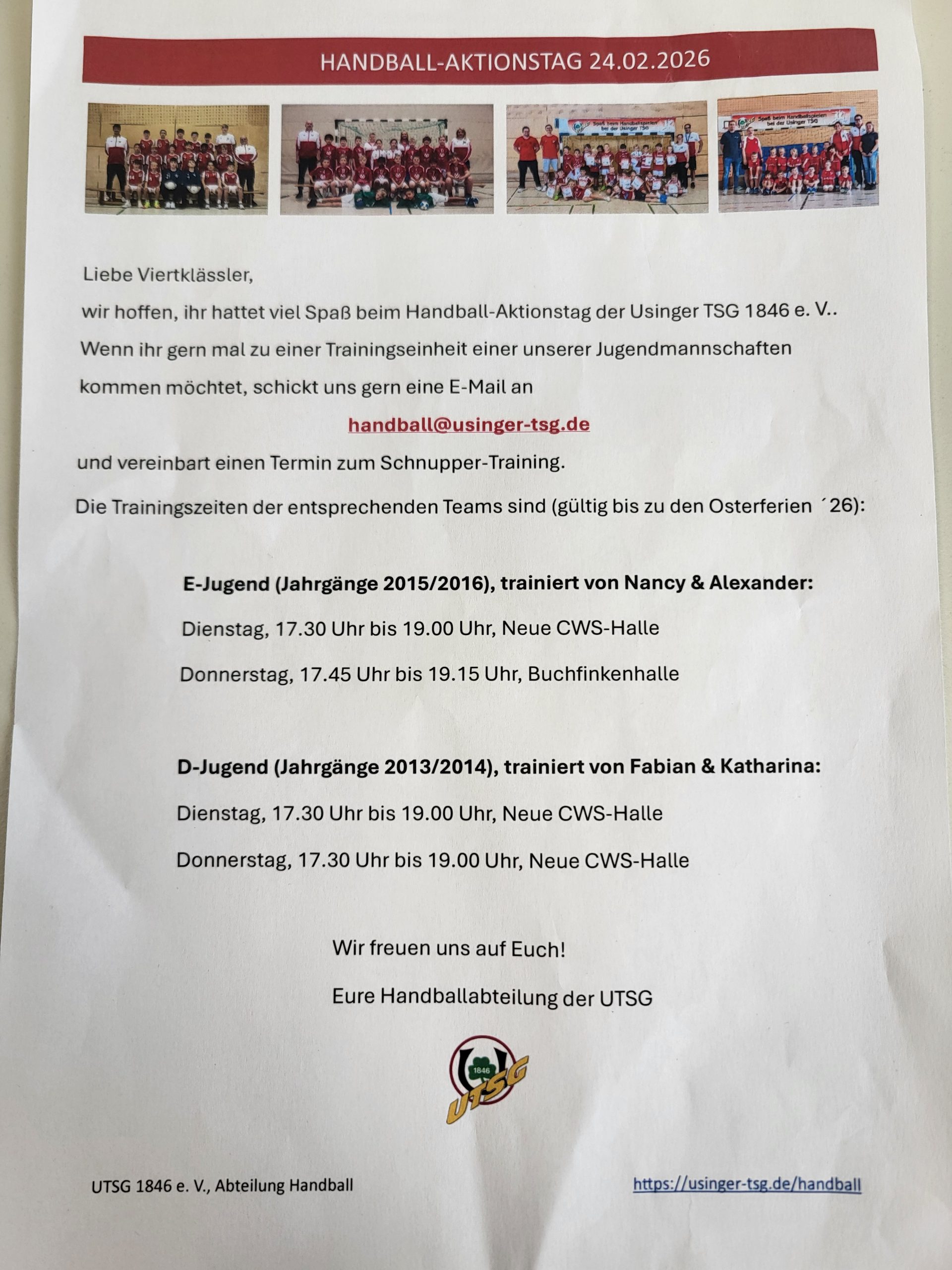 Am 24. Februar 2026 fand für den Jahrgang 4 der Astrid-Lindgren-Schule ein Handballaktionstag statt und zwar endlich einmal in unserer eigenen neuen Turnhalle. Unter der Anleitung eines Trainerteams der Usinger TSG hatten immer zwei Klassen die Möglichkeit, eine Doppelstunde in die Sportart Handball hinein zu schnuppern. Nach verschiedenen Geschicklichkeitsübungen mit dem Handball, Fang- und Wurfübungen wurden dann auch erste Torwürfe geübt. Abschließend fand dann ein richtiges kleines Handballspiel statt. Alle Kinder waren mit Elan und Begeisterung dabei. Vielen herzlichen Dank an das Trainerteam der Usinger TSG. Interessierte Kinder dürfen sehr gern ins Training kommen. Die Trainingszeiten finden sie auf dem Flyer.